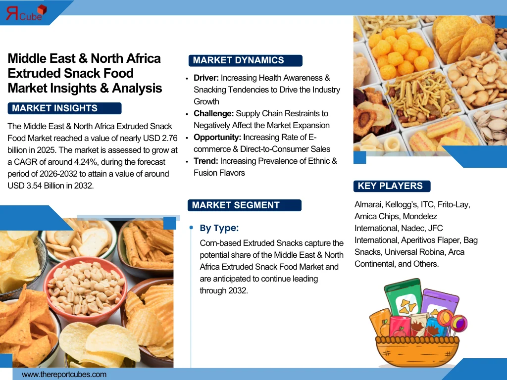 According to recent study by The Report Cube future of the Middle East & North Africa Extruded Snack Food Market reached a value of nearly USD 2.76 Billion in 2025. The market is assessed to grow at a CAGR of around 4.24%, during the forecast period of 2026-2032 to attain a value of around USD 3.54 Billion in 2032.