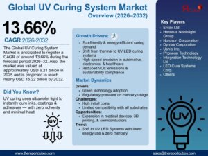 According to recent study by The Report Cube future of the UV Curing System Market is anticipated to register a CAGR of around 13.66% during the forecast period 2026–32. Also, the market was valued at approximately USD 6.21 billion in 2025 and is projected to reach nearly USD 15.22 billion by 2032.