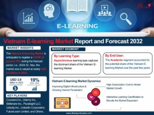 According to recent study by The Report Cube future of the Vietnam E-learning Market is anticipated to register a CAGR of around 19% during the forecast period, i.e., 2024-32. Also, the market size is valued at nearly USD 3.9 billion in 2023
